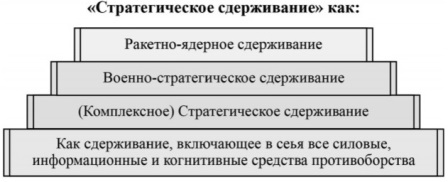 Соответственно и понятие «стратегическое сдерживание» в XXI веке претерпевает существенное изменение. Оно значительно расширяет представления о стратегической обороне до широкого понятия «противоборство», включающего набор самых разных инструментов[5].