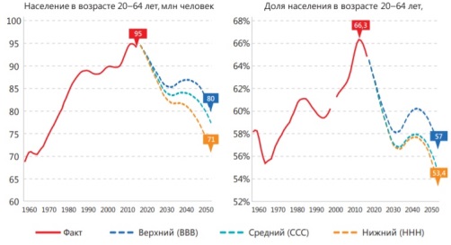 Рис. 1. Численность и доля населения России в возрасте 20–64 лет. 1960–2050 гг., с 2007 г. — три варианта прогноза (млн человек и %)[1]