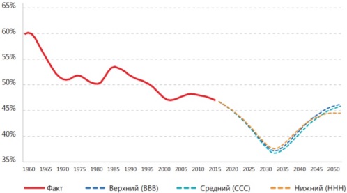 Рис. 2. Доля населения в возрасте 20–39 лет в населении 20–64 лет. 1960–2050 гг., с 2017 г. — три варианта прогноза[3]