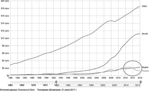 Теперь, чтобы даже приблизиться к ведущим странам (или, как говорил В. В. Путин, войти в пятерку развитых государств)[6], потребуются фантастические усилия, которые, не будучи сделанными, обрекут Россию на десятилетия стагнации и последующего развала государства.
