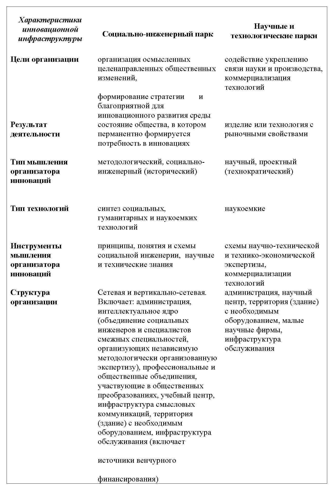 С тем, чтобы наглядно показать принципиальные различия между социально-инженерным парком и известными видами инфраструктур, сравним их основные характеристики, которые сведены в нижеследующую таблицу.