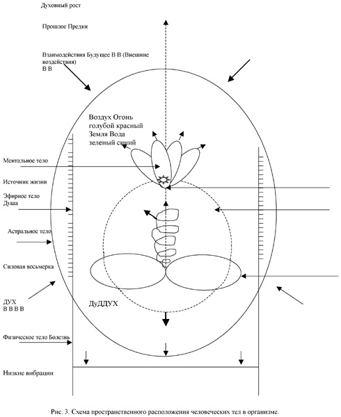 Человеческие тела в организме взаимодействуют по принципу: причина, изменение энергии, возникновение силы, проявление действия как следствия и устанавливается причинно-следственная связь. Физическое тело способно непосредственно влиять на физический мир и более тонкие миры. Поскольку в нашем теле содержится до 70% воды, то информация в виде голограмм записывается водой и может храниться, использоваться, творить и быть орудием творчества. Болезни – это есть нарушенные ПСС. Эфирное тело– проводник жизненной энергии ЦИ, видится в виде волосков, стоящих перпендикулярно к коже на расстоянии 10-15 см и имеет цвет молодого цветка персика. Астральноетело – проводник желаний, чувств, эмоций и является фантомом физического тела, может отделяться от него и действовать самостоятельно, получать впечатления без посредства физического тела и его органов. Примеров таких очень много описано в литературе и в истории. Яйцеобразная астральная газообразная аура может быть видима и сфотографирована. Она предназначена для обслуживания сигналов души. Погашать тяжелые эмоции от окружающих или смягчать, а слабые сигналы –усиливать. Ментальное тело является проводником и преобразователем мыслей, служит равновесием стихий: Огня, Воды, Земли, Воздуха. Причинный образ этого равновесия – четырехлепестковый тюльпан над родничком. Такое состояние ментального тела может быть только у высокоосознанного духовного лица. Фактически, из-за двойственного противоречивого мышления, беседы с внутренним оппонентом, порождают коллоидноподобное силовое поле – ментал (типа медузы) – результата взаимодействия противоречивой мысли с вакуумом и окружающим пространством. Ментал искажает принцип зеркального отображения, стягивает разрозненные поля мертвых, конденсирует их, втягивает в себя, закрывает Источник Жизни и гаснет для Духовного мира. Переразвитие ментала внутренним оппонентом ЭГО приводит к полевой форме “седалища” на голове и к трагическим последствиям. Причиной может быть накопление усталости, когда тело начинает перестраиваться под новую силовую форму, изменяется состояние воды и протоплазмы в клетках, что ведет к заболеванию организма. Это сигнал, что у человека сбой и неприятности по судьбе. Тело Причин(казуальное) определяет начало восхождения к Абсолюту и представляет собой опыт воплощения Души, который проявляется в виде характера человека в зависимости от условий его жизни. Способности человека, талант, свойства записываются в Причинном теле в виде зародышей, которые необходимо развивать. Тело Причинности является низшим аспектом Духовного тела и в нем присутствует память воспоминаний прошлого, качества остальных тел, опыт сознания (подсознания) и сверхсознания, а также носитель нашей воли.