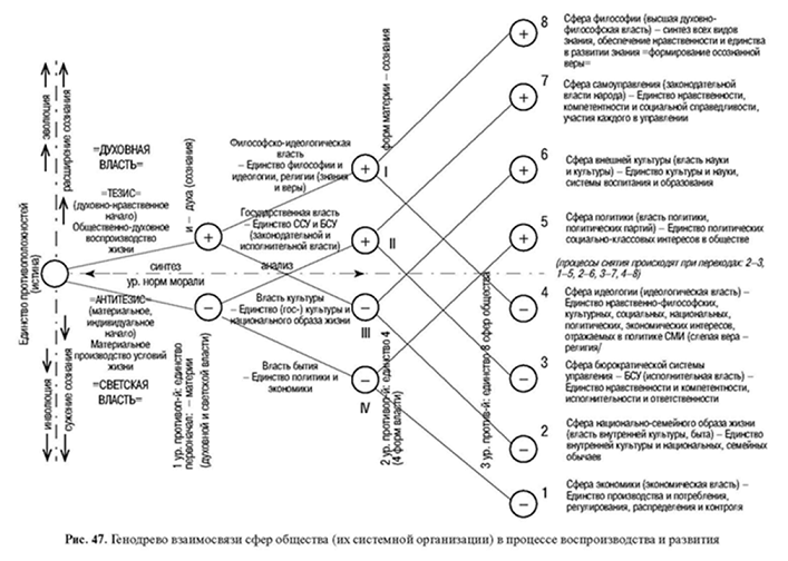 Анализ генодрева взаимосвязи сфер общества показывает, что гегелевское понимание государства, как вместилища абсолютного духа и единства - искусства, религии (веры) и философии следует дополнить. Государство - организованное и структурно, взаимосвязанное единство всех сфер общества (философии, идеологии, морали, культуры и образа жизни, системы управления, политики и экономики), гармоническое единство и эволюционное развитие которого возможно только при приоритете сферы нравственного мировоззрения и конкуренции социально-нравственных идеологий. Высшей властью в обществе является – 8-я сфера - единое духовно-нравственное мировоззрение (философия), которой последовательно подчиняются все остальные сферы, формирующие в: единой идеологии (4) - осознанную мораль и веру; самоуправление, законодательную власть (7) - социальные: отношения, справедливость; исполнительную власть (3) - участие всех в управлении, социально-нравственном изменении общества; науке, системе образовании (6) – рост духовного уровня воспитания, образования национально-семейной культуры (2) - образа жизни; политике (5) - политического самосознания; экономике (1) – взаимозависимого изменения уровня потребления, производства и сохранения природы.