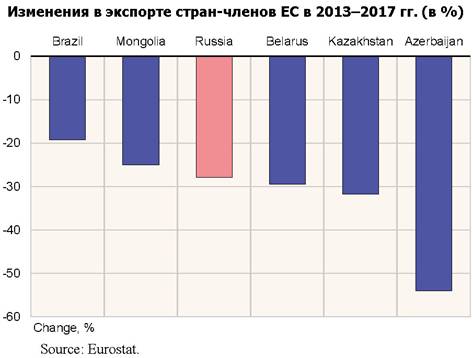 Изменения показывают, что на динамику экспорта стран-членов ЕС в Россию влияли более общие факторы, а не только санкции. Так, экспорт из стран ЕС в Азербайджан, Казахстан и Беларусь (государств, которые не попали под санкции) упал большем, чем в Россию в основном по двум причинам: во-первых, из-за общего ухудшения макроэкономической обстановки, а, во-вторых, из-за переориентации части торговых потоков на другие рынки – Азербайджанского на Иран и Турцию, а также Китай, Казахстана на Китай, а Белоруссии из-за внутренних причин. Учитывая же ничтожную долю в торговле стран ЕС с этими государствами, можно сказать, что возможные санкции США за торговлю с Россией вообще не будут даже замечены на фоне доминирования российской торговли.
