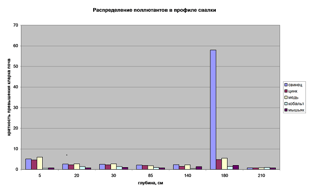 Распределение поллютантов по профилю свалки любопытно тем, что в данном профиле на глубине 140-180 см выявлен погребенный гумусовый горизонт, который по содержанию ТМ оказывается более загрязненным, чем верхний слой техногенных отложений и подстилающий слой почвообразующего суглинка, т.е. выполняет роль геохимического барьера для веществ-загрязнителей.