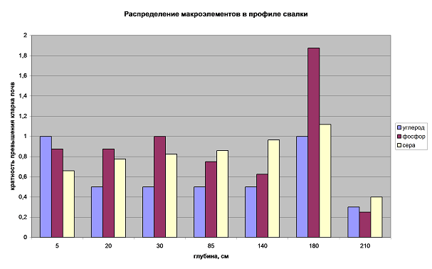 Содержание в профиле ТМ и мышьяка положительно коррелирует с распределением макроэлементов - углерода, фосфора и серы. Содержание углерода максимально в верхнем покрывающем свалку и нижнем погребенном почвенных горизонтах; содержание серы устойчиво возрастает с глубиной до максимума в погребенном гумусовом горизонте, ниже которого превышений не наблюдается; содержание фосфора также максимально в слое погребенной почвы (рис. 3).