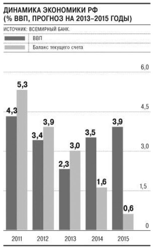 Печально, что подобная недооценка роли восточных регионов России в Евразии в целом происходит на общем неблагоприятном фоне изменения в соотношении мировых сил для России. В первой половине 2013 года, например, эксперты ВБ ожидали роста ВВП развитых стран в 2013 году на 1,2%, развивающихся - на 5,1%. По мнению аналитиков банка, глобальная экономика ускорится к концу 2013 года, ожидая ее роста на 3% в 2014 году и 3,3% в 2015 году: это на 1-2 процентных пункта ниже значений предкризисного экономического бума, но выше, чем в 1990-х годах. На этом фоне резкое ухудшение прогноза по России авторы отчета объясняют достаточно традиционно: это сокращение экспорта из-за падения спроса на него со стороны основных торговых партнеров, прежде всего стран ЕС, а также связанное с этим ослабление внутреннего спроса, отчасти объяснимое ростом цен и стагнацией доходов компаний и населения[10].