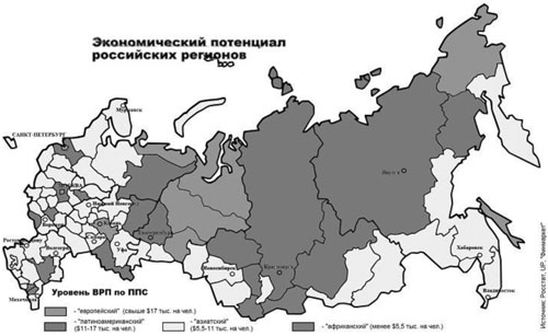 В то же время для большинства российских регионов, включая Сибирь и Дальний Восток, все чаще становятся соседями развивающиеся страны Африки и Юго-Восточной Азии, а в "самом низу" российского списка - Ингушетия ($3,3 тыс.) и Чечня ($2,9 тыс.), что соответствует уровню доходов Филиппин и Вьетнама[13].
