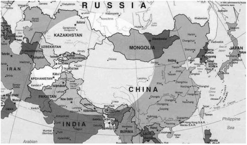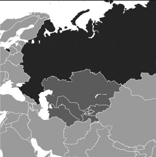 Как видно на карте, которая нередко используется в качестве иллюстрации ситуации в Евразии, центром потенциальных конфликтов в Евразии прогнозируется ЦА, причем для России этот акцент смещается в область бывших советских среднеазиатских республик. Прежде всего Казахстана, дестабилизация которого для России может иметь катастрофические последствия из-за близости регионов Поволжья, Южного Урала, Западной Сибири и транспортного коридора "Запад-Восток".