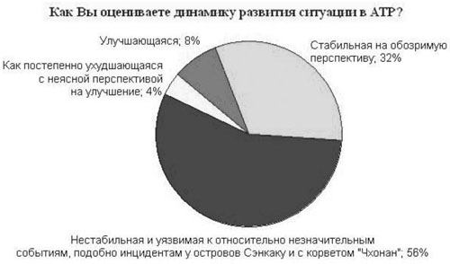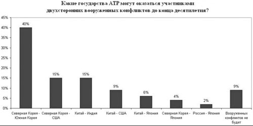 Иными словами, новое соотношение сил в мире и новая политика ведущих государств во многом предопределяется ситуацией в Евразии и АТР. В Евразии и АТР возможен наиболее широкий спектр конфликтов в мире (по некоторым оценкам, во втором десятилетии XXI века на Евразию приходилось около 80% всех военных конфликтов). Так, по оптимистичным оценкам экспертов РИСИ, в АТР во втором десятилетии нынешнего века существует вероятность следующих конфликтов[25].