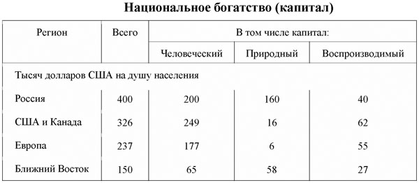Стратегия евразийской интеграции России должна исходить из необходимости обеспечения сохранения и развития нации, ее национального человеческого капитала (НЧК), измеряемого как количественными (демографическими), так и качественными показателями[67]. Для этого у России и ее партнеров по евразийской интеграции есть все базовые условия. Напомним, что в конце ХХ века Всемирный банк (ВБ) предложил новую концепцию измерения национального богатства (капитала) страны, включающего человеческий, природный и воспроизводимый капитал. Приведем расчет величины капиталов, предложенный ВБ[68] для различных сегментов мирового пространства.