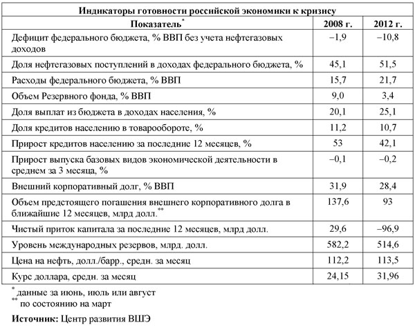 Более того, возможное нарастание кризисных явлений в 2012-2015 годах в экономике России уже не может быть компенсировано "классическими" методами правительства по преодолению кризиса "образца 2008 года". Осенью 2012 года это стало наглядно видно из сравнения ситуаций, сложившихся в экономике страны в 2008 и 2012 годах[20].