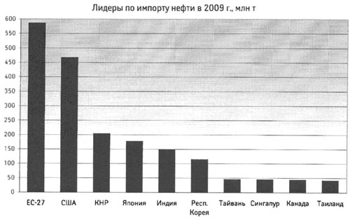 Неоспоримым лидером по импорту нефти среди стран остаются США (467 млн т в 2009 г.), закупки которых стабильно сокращаются благодаря проведению энергосберегающей политики, растущему использованию альтернативных источников энергии и постоянному увеличению глубины нефтепереработки. В последние годы отмечается динамичное расширение китайских импортных потребностей в нефти, в результате КНР в 2009 г. переместилась на второе место (204 млн т), оттеснив на третью позицию Японию (177 млн т), которая резко сократила закупки нефти под воздействием мирового экономического кризиса. Высокие темпы роста спроса на нефть обусловили выход Индии (149 млн т) на четвёртое место по ввозу данного сырья, Республика Корея переместилась на пятое (114 млн т).