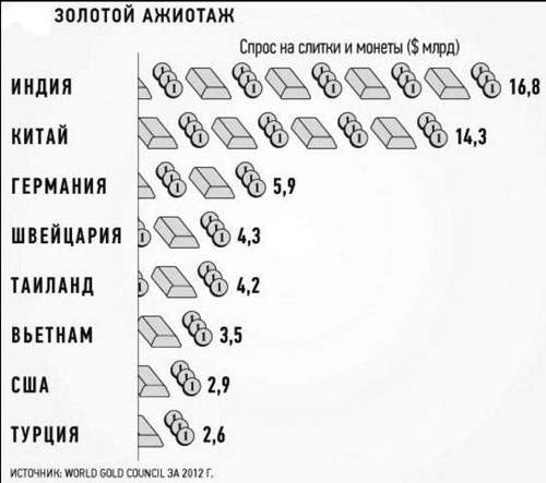Возможность частичного возвращения к золотому стандарту рассматривали и другие страны: проект "золотого (исламского) динара" для стран мусульманского мира был предложен в 2001-м, слухи о "золотом юане" ходят с 2007 года; а в марте 2011-го Консервативная партия Швейцарии выступила с инициативой введения в обращение золотого франка. При этом, по данным Всемирного совета по золоту, в 2012-м мировой спрос на этот металл упал на 4%, а инвестиционный спрос - почти на 10%[36]. При этом подобное падение не изменило в целом рост недоверия к доллару и долгосрочную тенденцию роста спроса на золото.