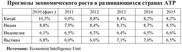 Экономики азиатских стран демонстрируют высокие темпы роста ВВП, которые в несколько раз превосходят данный показатель у развитых стран. Средний показатель роста ВВП развивающихся стран Азии может составить 8,4% в 2011 и 2012 гг., в то время как в развитых странах экономика вырастет только на 2,2% в 2011 г. и 2,6% в 2012 г. По оценкам МВФ, Китай станет крупнейшей экономикой мира по объему ВВП и обойдет нынешнего лидера США уже в 2016 г. и при этом сохранит высокие темпы роста.