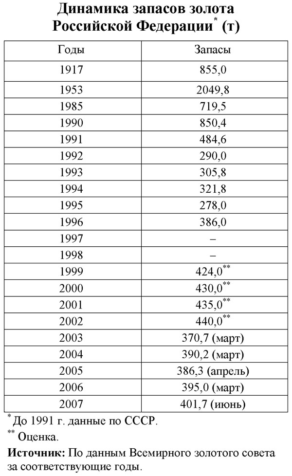 От Советского Союза Россия унаследовала в 1991 г. 485 т золота. В 1993 г. золотой запас России был равен 305 т, или 9,8 млн тройских унций. По этому показателю страна занимала 17-е место в мире.