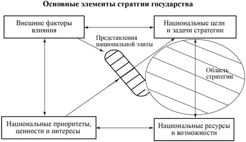Поэтому чрезвычайно важно адекватно оценить эти внешние факторы, недооценка или переоценка которых непосредственно влияет на реалистичность поставленных целей и эффективность использования национальных ресурсов. В приведенном рисунке, отображающем основные элементы стратегии, эти внешние факторы занимают следующее место: