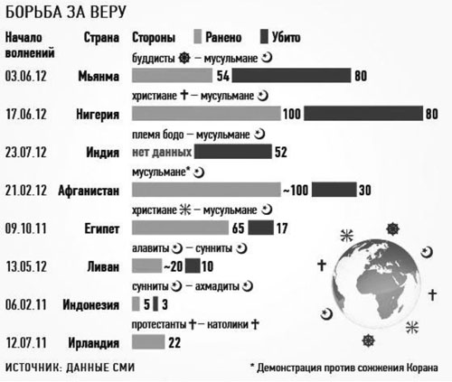 Насильственное внедрение либеральной системы ценностей стало официальной политикой США и Евросоюза, отодвигая в ряде случаев на второй план даже политику, основанную на национальных интересах этих стран. Причем "демократизация", сопровождающая глобализацию, в т.ч. насильственными способами, отнюдь не уменьшает такого цивилизационного и религиозного противостояния. Достаточно сказать, что одним из последствий "арабской весны" стало усиление и даже обострение религиозных противоречий, которые стали принимать устойчивую социальную окраску и приводить к реальным жертвам среди населения. Так, "исход" коптов из Египта начался сразу после революции, превысив в первую половину года 100 тыс. человек[6], а события лета 2013 года в Египте и Сирии лишь ускорили эту тенденцию.