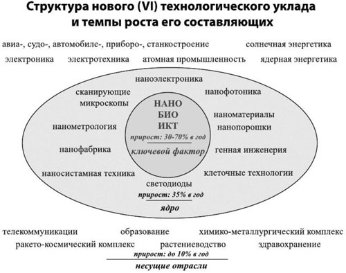 Но, главное, "фазовый переход" требует от России реальной политики опережающего развития, в результате которого Россия должна перейти в новый технологический уклад. Это возможно при параллельном развитии - последовательном одновременном "догонянии" и "скачке", перескакивании через этапы. Эти два процесса необходимо совместить, а не противопоставлять один другому, что вполне возможно, если они будут опираться на приоритетное развитие НЧП: технологические заимствования будут становиться частью национальной инновационной системы развивающейся на базе отечественной фундаментальной науки, НИОКР и образовании.