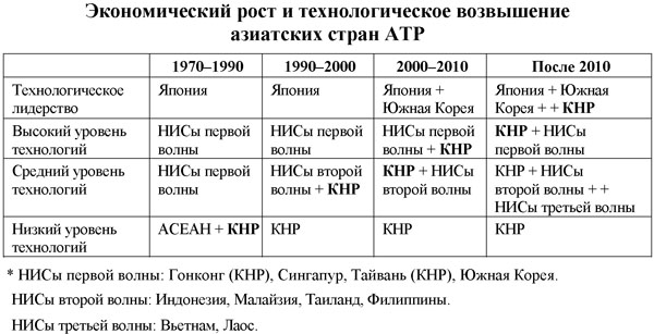 С конца 1970-х гг. в цепочку начал встраиваться и Китай, при этом он привнес в данную логическую схему принципиальные новации. Экономический и технологический рост в КНР крайне неравномерно разворачивается в территориальном разрезе. Фактически вверх по шкале развития с разными темпами движутся отдельные провинции.