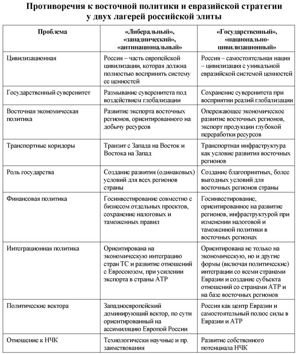Таким образом, к началу в XXI веке периода "фазового перехода" российская нация превратилась в уникальную цивилизацию, объединенную по большинству этнических, исторических, культурных, духовных и экономических признаков в нацию - цивилизацию, занимающую большую часть Евразии. У этой нации - цивилизации есть единственная возможность сохранения себя и государства только в движении на восток. Что начинает осознаваться правящей элитой страны. Но, если ее либеральная часть, поддерживая новую восточную политику, ориентируется прежде всего на использование природных ресурсов восточных регионов в интересах увеличения экспорта России в АТР, то другая часть элиты и экспертного сообщества понимает значения восточных регионов как центра евразийской интеграции и потенциала сотрудничества со странами АТР. Таким образом, сегодня, по сути одновременно, существуют две восточные политики и концепции евразийской интеграции, которые существенно, принципиально отличаются друг от друга. В условиях периода "фазового перехода" подобная двойственность и неопределенность недопустима, так как в этих двух подходах существуют принципиальные противоречия, которые в основном сводятся к следующему.