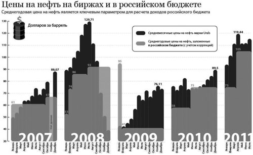 И, наоборот, в России в эти же годы отчетливо наблюдалась обратная тенденция, которая в концентрированном виде выражалась в росте зависимости формирования доходной части бюджета от нефтегазовых доходов. Так, если в 2007 году нефтегазовые доходы бюджета оценивались из расчета 61 долл. за баррель, то в 2011 году в 105 долл. При этом большинство экспертов полагает, что падение цены на нефть ниже 90 долл. за баррель, как это было, например, в феврале 2005 года, когда цена упала до 41 долл., неизбежно ведет к дефициту бюджета[45].