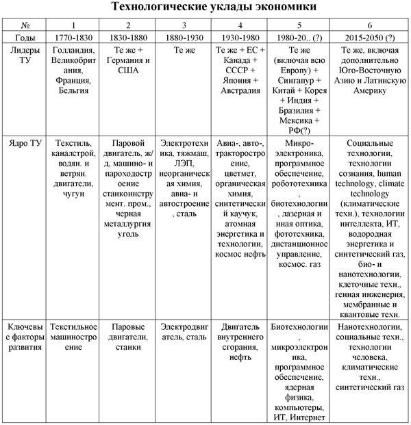 "Для России 6-й ТУ экономики, считает Ю. Корчагин, - пока принципиально не достижим, как, впрочем, и 5-й уклад. Для этого предварительно необходимо в условиях конкуренции и профессиональных реформ создать высококачественные системы воспитания, культуры, образования, науки и конкурентоспособное качество жизни. Распад СССР - это накопленный отрицательный опыт, доказывающий сделанные выводы"[59].