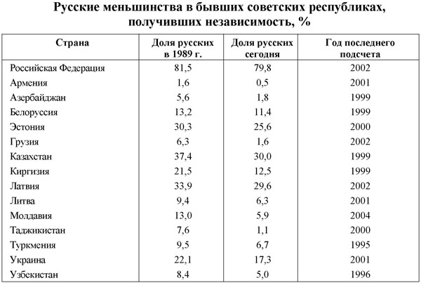 Но и за пределами Российской Федерации шел процесс сокращения "русского присутствия". Как отметил Д. Тренин, "После обретения независимости русских стали увольнять или вытеснять с ответственных постов в правительстве, государственном аппарате, полиции, вооруженных силах, образовании и других важнейших структурах"[56].