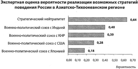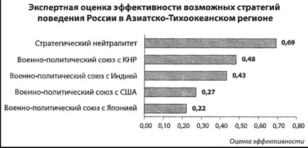 По сути дела это означает, что в среде правящих кругов нет сформулированного - стратегического евразийского курса: значительная часть элиты ориентируется на либеральную систему ценностей и интересы США, другая, тоже значительная часть, - на союз с КНР, Индией и Японией. Примечательно, что среди оценки эффективности возможных стратегий вообще не упоминается стратегия евразийской интеграции, к которой косвенно, в качестве пассивной версии, может относиться только "стратегия нейтралитета".