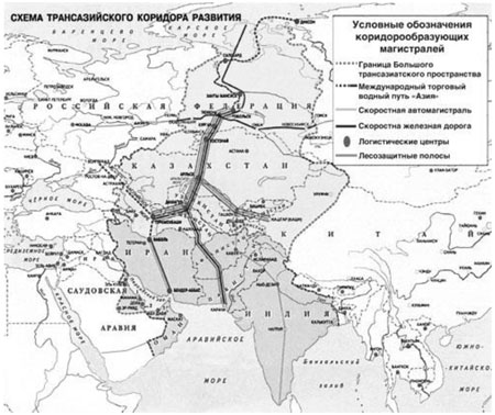 И наоборот: системное и опережающее развитие транспортных коридоров как с запада на восток, так и с севера на юг позволяет не только развивать восточные регионы, но и предоставляет России колоссальные преимущества во всем процессе евразийской интеграции, сохраняя за ней не только географическое, но и политическое место универсального центра Евразии. Так, например, реализация проекта ТРАЗКОР обеспечивает не только кратчайшее расстояние между Северным морским путем и Южным морским путем (4500 км), но и резко усиливает значение широтных транспортных коридоров (Транссиба и Турксиба), создавая новые мощные транспортные развязки и центры развития[22], что хорошо видно на следующей карте.