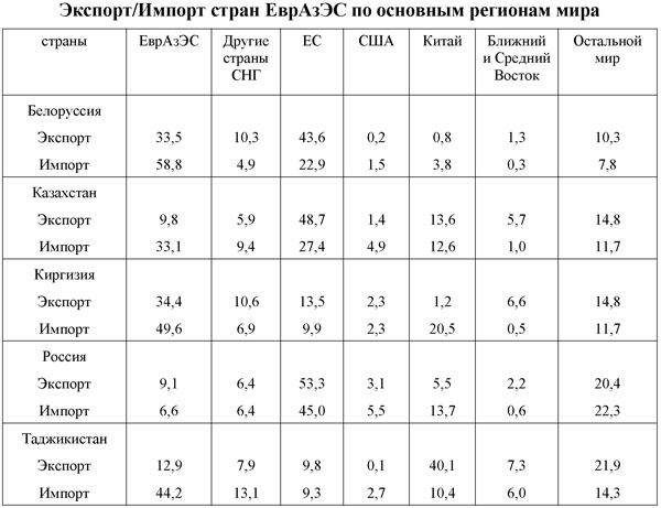 Характеристика внешнеторговых потоков стран-участников ЕврАзЭС/ТС/ЕЭП, представленная в таблице, показывает, что за пределами их общего интеграционного пространства нет центра, сравнимого по экономическому влиянию с Россией, особенно в том, что касается роли РФ в качестве источника импорта. Другими словами, бремя решающего вклада в функциональное поддержание жизнеспособности хозяйственных систем всех партнеров в среднесрочной перспективе будет лежать на российской стороне.