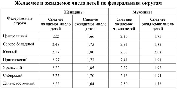 Ожидаемое число детей выше двух только у мужчин Южного федерального округа, но у женщин ни в одном округе среднее ожидаемое число детей не превышало 1,85, хотя желаемое число детей - выше двух. Эта разница свидетельствует о необходимости введения дополнительных мер демографической политики, которые позволят частично сократить разрыв между желаемым и ожидаемым числом детей (в то же время остается актуальной и более сложной задачей - повысить желаемое число детей)[21].