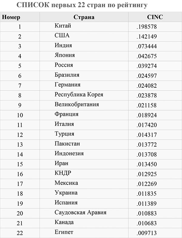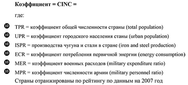 [3] Сводный индекс национального потенциала (англ. Composite Index of National Capability, CINC) – статистическая оценка национальной мощи, созданная Дж. Дэвидом Сингером для проекта Correlates of War в 1963 году.