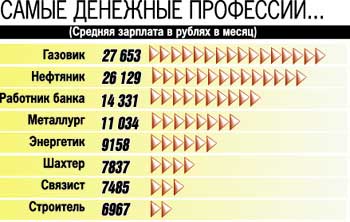 В два раза меньше газовиков, если верить Госкомстату, получают работники банков (14 331 руб./мес.). Однако исследования независимой консалтинговой компании `АНКОР` показывают, что, к примеру, в Москве даже рядовые служащие банков и частных компаний редко зарабатывают меньше 1000 долларов в месяц. А оклады начальства средней руки начинаются от 2 - 3 тысяч у. е.