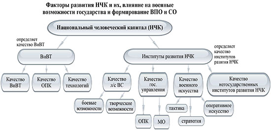 На рисунке показано, что качество ВиВТ, личного состава и управления ВС является прямым следствием качества развития НЧК и его институтов в данной ЛЧЦ и государстве. Ни военные технологии, ни военнослужащие, ни органы управления не могут быть по своему качеству и эффективности выше общенациональных. В этом заключалась, например, главная проблема Красной армии в 1941 году: качество личного состава, командиров, управления, значительной части ВиВТ отставало от аналогичных показателей в Германии за редким исключением. Там, где этого германского превосходства не было (в Пограничных войсках и некоторых частях Красной Армии, которые, например, обороняли Перемышль), даже в первые месяцы войны наблюдалась высокая боевая эффективность частей. И эту разницу в качестве НЧК не удавалось даже компенсировать количеством НЧК, т.е. демографически. Не случайно военные потери Германии и СССР были несопоставимы даже несмотря на конечное поражение Германии.