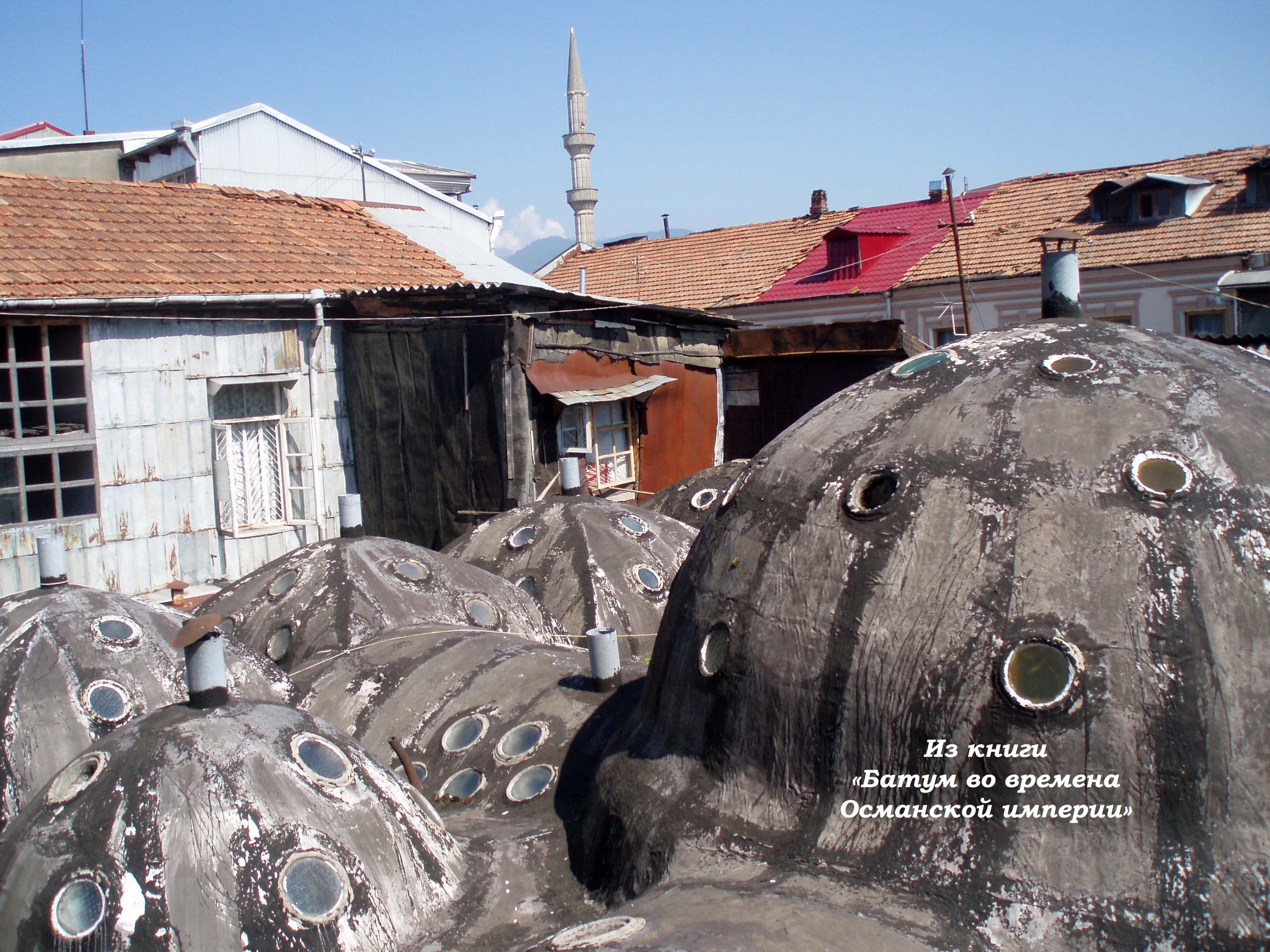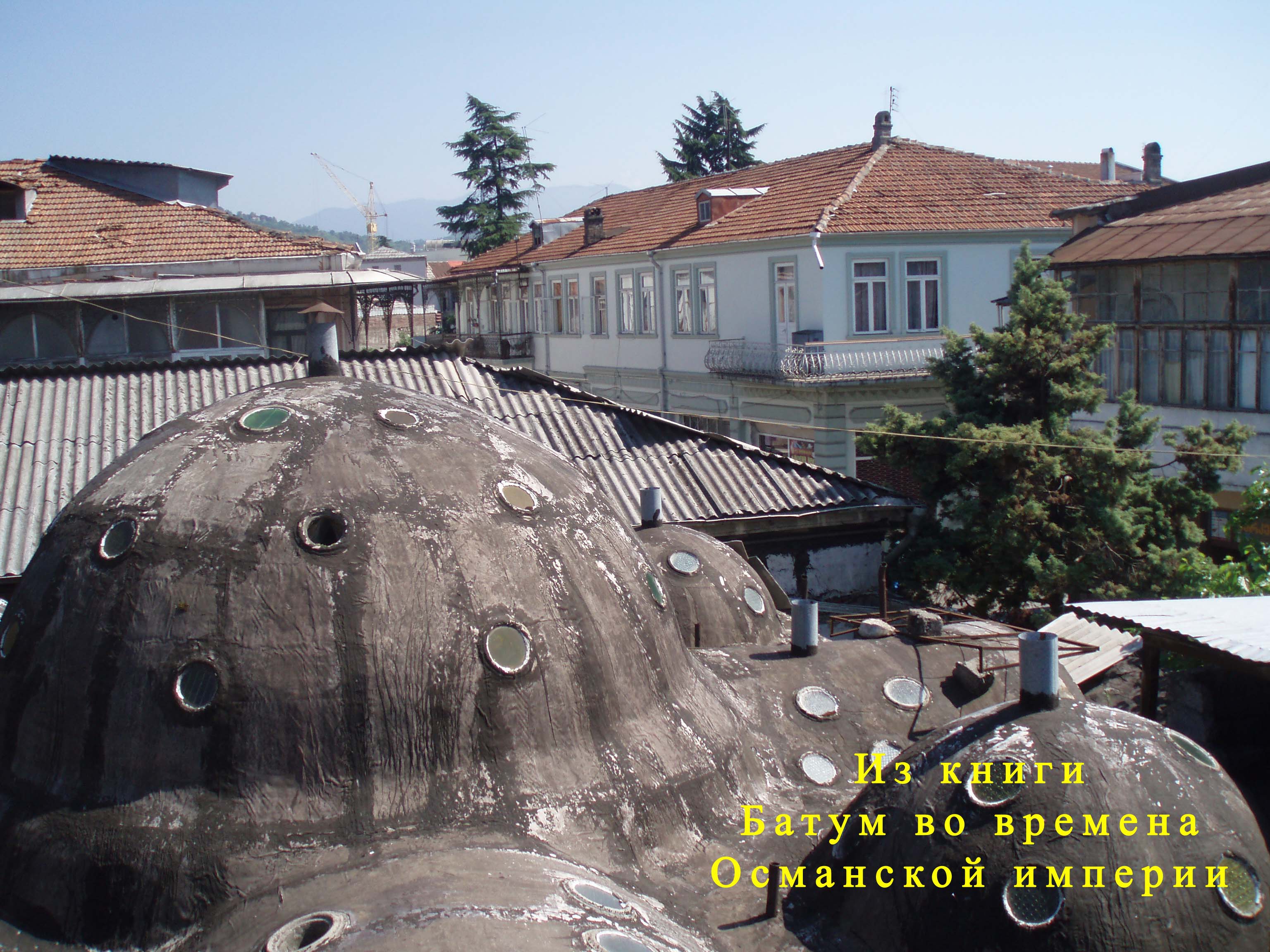 "...скажем кстати кое-что и о банях, которые в ряду других зданий города, выделяются своими крышами, представляющими цементные купола полушарообразной, а иногда и грушевидной формы, усеянные небольшими выпуклыми круглыми стеклами. Самая обширная из бань - это так называемая губернаторская - довольно неуклюжее здание из дикого камня, увенчанное пятью куполами, причем средний больше всех.