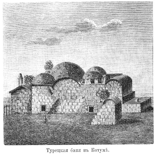 Посещаются бани очень усердно, во все дни недели и преимущественно вечером. Турчанки и вообще женщины имеют свой день - четверг. Баня для турецкой женщины заменяет вполне клуб, только здесь она может, без всякого стеснения обыкновенным этикетом, наболтаться со всеми своими знакомыми, а потому и неудивительно видеть у бань, в особенности вечером, много экипажей, ожидающих у подъезда, иногда часа по четыре и более, своих владетельниц".