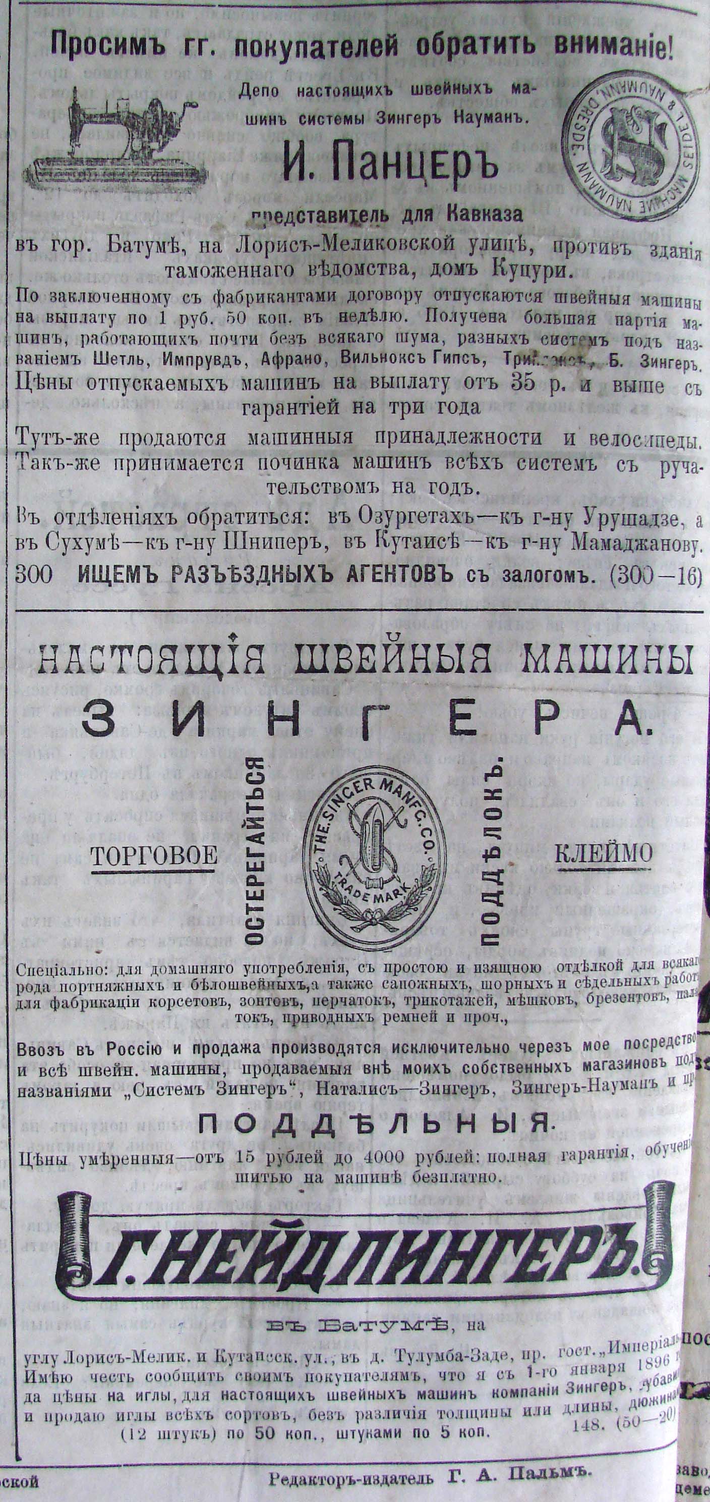 Семья Панцер, (фото N 262, 263) помимо владения серными ваннами, являлась официальным дилером фирмы "Зингер" в Батуми. (Фото N 264, 265)