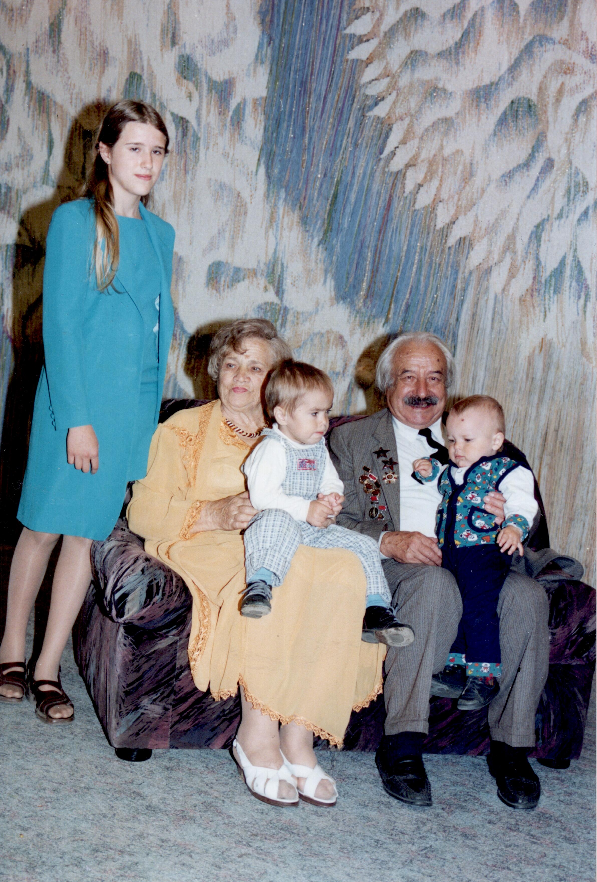 На фотографии дня Золотой свадьбы моих прадедушки и прабабушки Брусникиных – я (ещё малыш) на коленях у прадедушки Юры, а Максим –сын тёти Иры Брусникиной (чуть постарше меня) – на коленях у прабабушки Нины. Рядом с прабабушкой – Лена (дочь тети Иры).