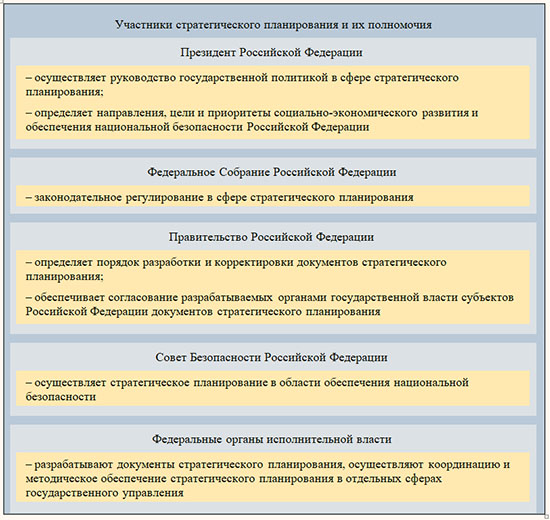 К участникам стратегического планирования относятся высшие органы государственной власти – Президент РФ, Федеральное собрание РФ, Правительство России, ФОИВ и Совет Безопасности, который осуществляет координацию деятельности всех государственных и общественных институтов[5]. Контроль за реализации осуществляется в ежегодном докладе Секретаря Совета Безопасности Российской Федерации Президенту России. При этом предполагается, что тот предложит некие показатели (которые пока что неизвестны)[6].