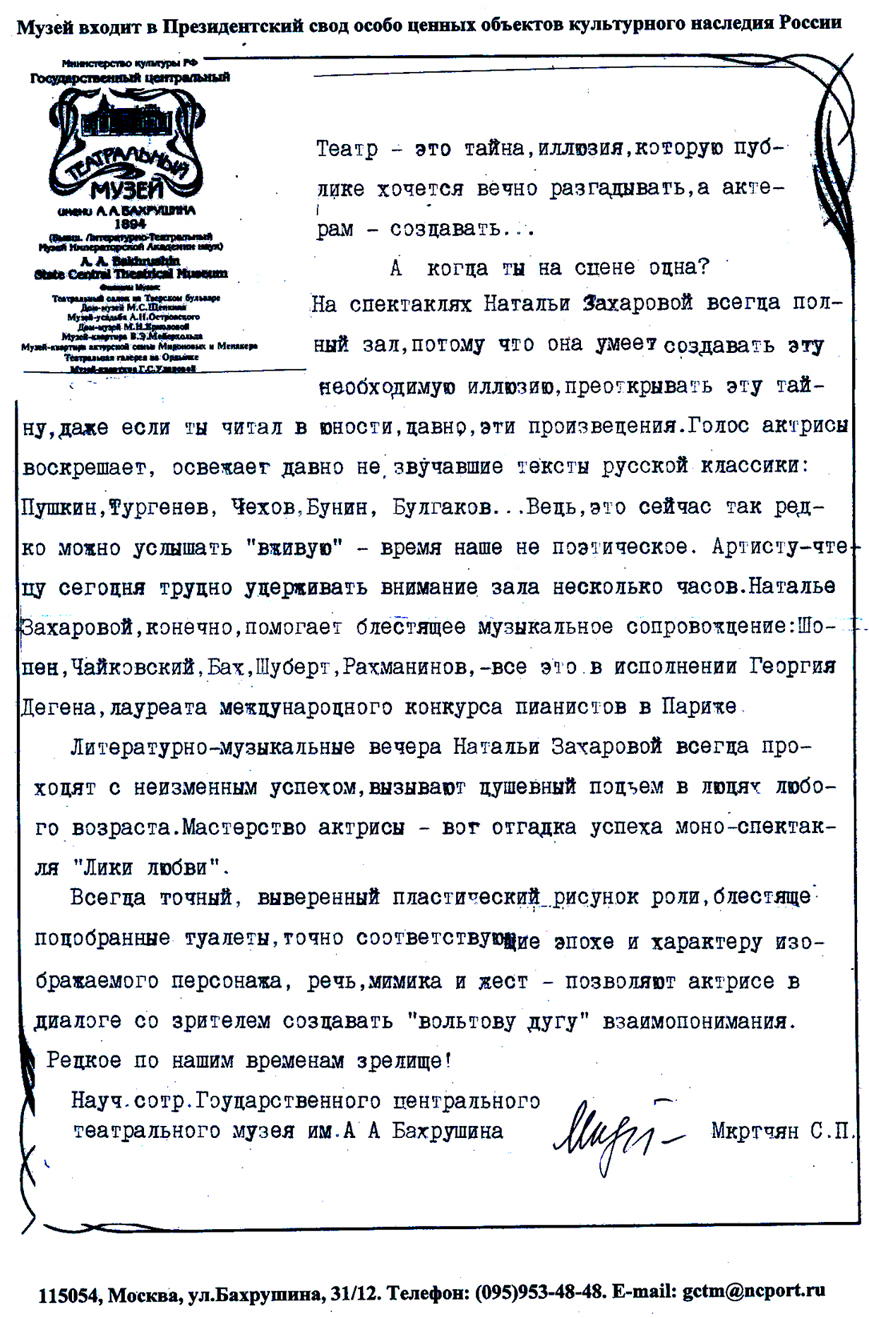 "Бунинские встречи на Красной Пресне 30 октября 2015, организованные к 145-летию писателя актрисой Натальей Захаровой, оставили в нас уверенную гордость за нашу Россию, наши искусство и литературу.