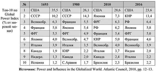 Включает: помимо показателей ВВП и военных расходов наличие ядерного оружия, развитие ИКТ, расходы на НИОКР, качество управления, численность рабочей силы (с поправкой на ее качество), объем международной помощи, ПЗИ, торговли, импорта-экспорта энергии[7]