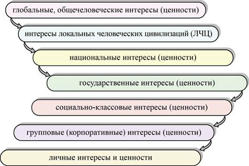Таким образом, общая приоритетность интересов и систем ценностей при самом общем подходе к анализу развития МО и ВПО в мире в принципе выглядит следующим образом: