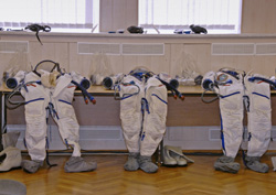 Вот так скафандры ждут космонавтов для примерки на космодроме Байконур.