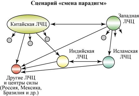 Пример № 3. «Смена парадигм». Один из сценариев доминирования новых центров силы и ЛЧЦ – либо «Китайский», «Индийский» или «Исламский», – который становится к 2050 году не только вероятным, но и реальным в результате разных, не известных до сих пор обстоятельств. Этот сценарий достаточно быстро и радикально меняет всю структуру современной МО.