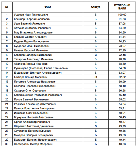 Описанная процедура очистки первичных рейтинговых показателей РААП позволяет построить более справедливый рейтинг российских экономистов. В этом смысле ЗРААП является более точным и представительным рейтингом по сравнению с «первичным» рейтингованием в РААП. Примечание: Необходимо подчеркнуть, что исследователи, получившие зеленый, желтый и красный статус, не являются заведомыми мошенниками, осуществляющими преднамеренное манипулирование данными РИНЦ. Это означает лишь то, что в отношении них получены факты об искажении их истинного научного вклада. Данные факты могут быть связаны как с несовершенством базы данных РИНЦ, так и с непреднамеренными действиями ученых относительно своих трудов и соавторов. Веденные цветовые исследовательские статусы напрямую не связаны с аморальными действиями участников системы РИНЦ. В любом случае разработчик рейтинга не берет на себя вынесение этических оценок. 5. Эмпирические результаты. Результаты расчетов по описанному алгоритму получены на данных по состоянию за январь 2016 года и приведены в табл.1.