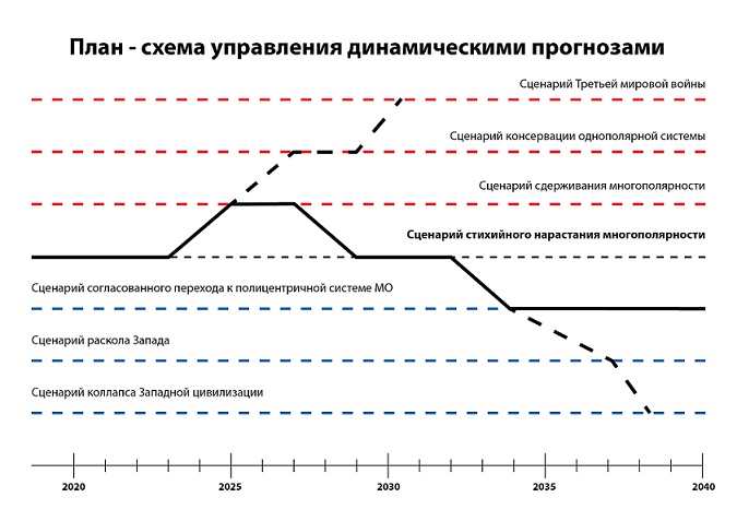 Как видно из приведенной диаграммы построение прогноза начинается с выявления оптимального вероятного сценария. Этот сценарий является по сути экстраполяцией современной ситуации в будущее. Его условно можно назвать «сценарием стихийного нарастания многополярности мировой системы».[1] Предполагается, что этот сценарий будет осуществляться в период до 2040 года, когда многополярная система МО в целом сформируется.