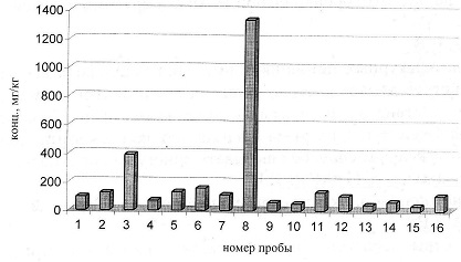 Для культурного слоя Челябинска отмечено высокое и аномальное содержание ряда химических элементов (табл. 1 и 2, рис. 6 и 7), в частности меди, свинца, цинка и хрома, в некоторых пробах и никеля.