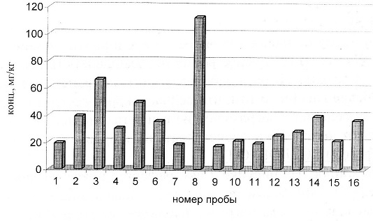 Рис. 7. Концентрации никеля в техногенных отложения г. Челябинска