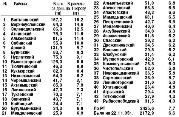 На первый взгляд, тенденция к росту производства молока налицо. Однако если рассматривать данные по отдельным районам, то далеко не везде высока продуктивность дойного стада. Если на фермах Верхнеуслонского и Балтасинского районов надои от каждой коровы превысили 5300 и 5100 килограммов молока, а в хозяйствах Зеленодольского и Алькеевского продуктивность возросла более чем на 860-830 литров, то в ряде районов она оставляет желать лучшего.